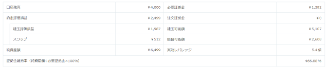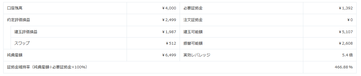 為替差益(建玉評価損益)も約2,000円のプラスとなっており、スワップと合わせると合計損益(約定評価損益)は+2,499円です。