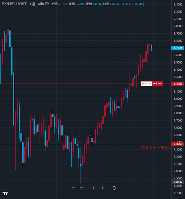 現在のレートは 8.7026 付近まで上昇しており、私の保有するポジションの平均約定価格(買サマリ)である 8.2057 を大きく上回っています。