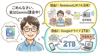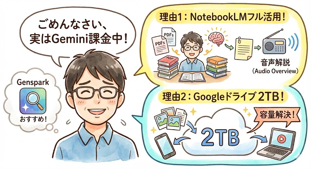 - 私のように「Googleドライブの容量が欲しい」「NotebookLMを使いたい」という具体的な目的があるなら、『Gemini』への課金が最適解になります。