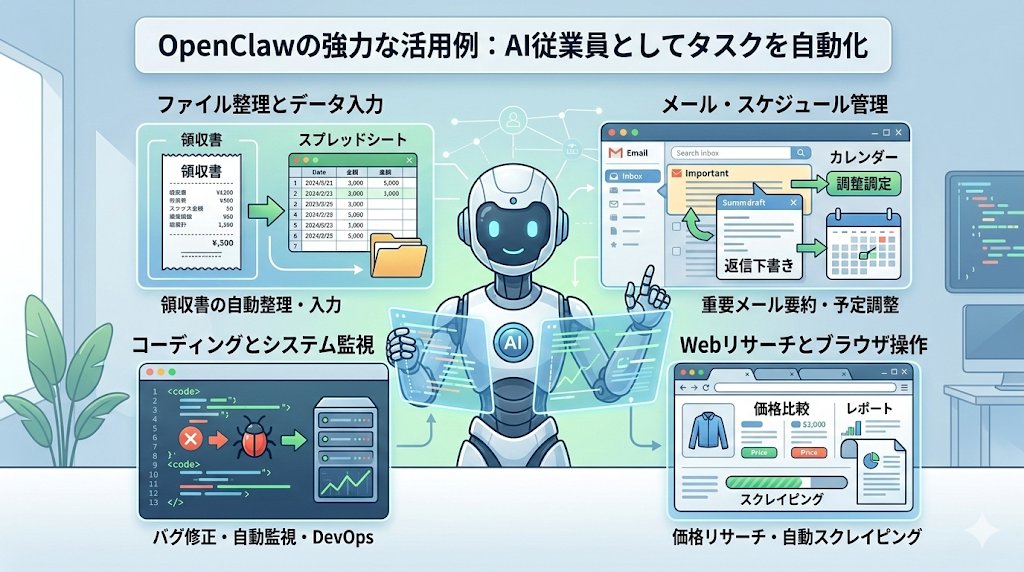 OpenClawは、日常の煩雑なタスクを自動化するための「AI従業員」として機能します。以下はその代表的な活用例です。