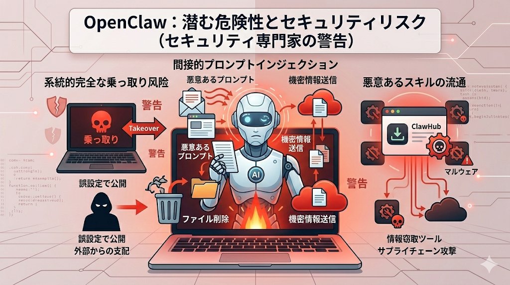 しかし、OpenClawの強みである「PCの深い権限を持つこと」は、そのまま致命的な弱点にもなります。セキュリティ専門家からは「悪夢」と評されるほどの懸念点が指摘されています。