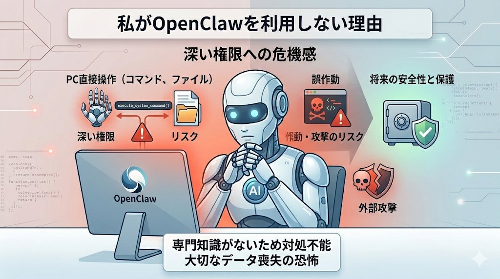 「PCの深い権限(ファイル操作やコマンド実行)をAIに渡すことになる」ことに危機感を感じているからです。