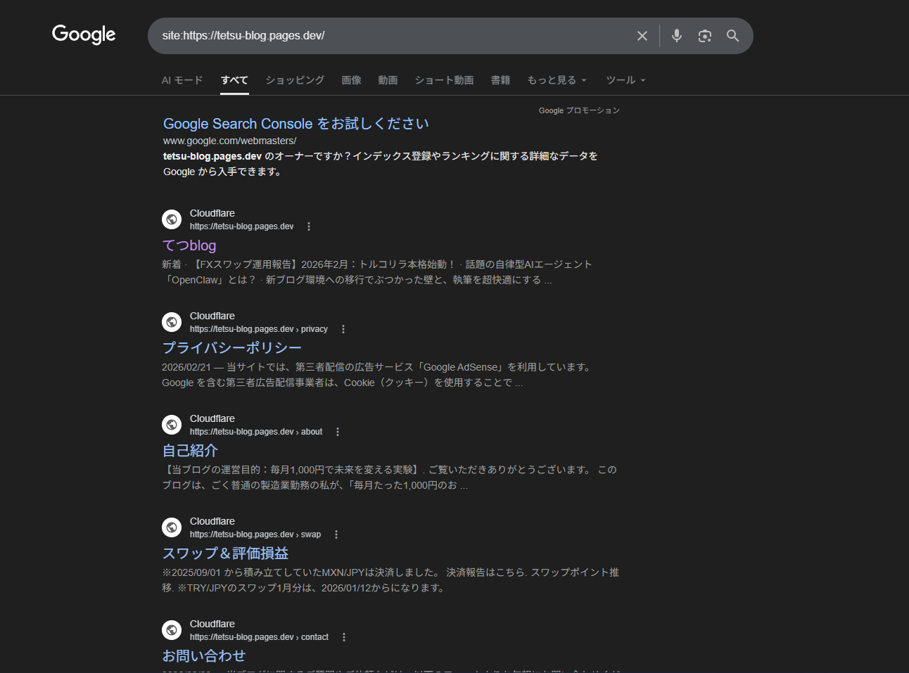 移行後、ブラウザで site:https://tetsu-blog.pages.dev/ と検索してみると……しっかりとGoogleの検索結果に私の記事たちが表示されていました!! Blogger時代にどれだけ足掻いても越えられなかった「インデックスの壁」を、爆速表示とクローラーの巡回しやすさのおかげで、ついに突破できたのです。あの時の歓喜は忘れられません。