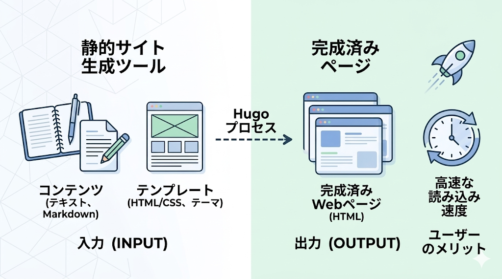 Hugoは、一言で表すと 「静的サイトジェネレーター(Static Site Generator = SSG)」 と呼ばれるツールの一種です。