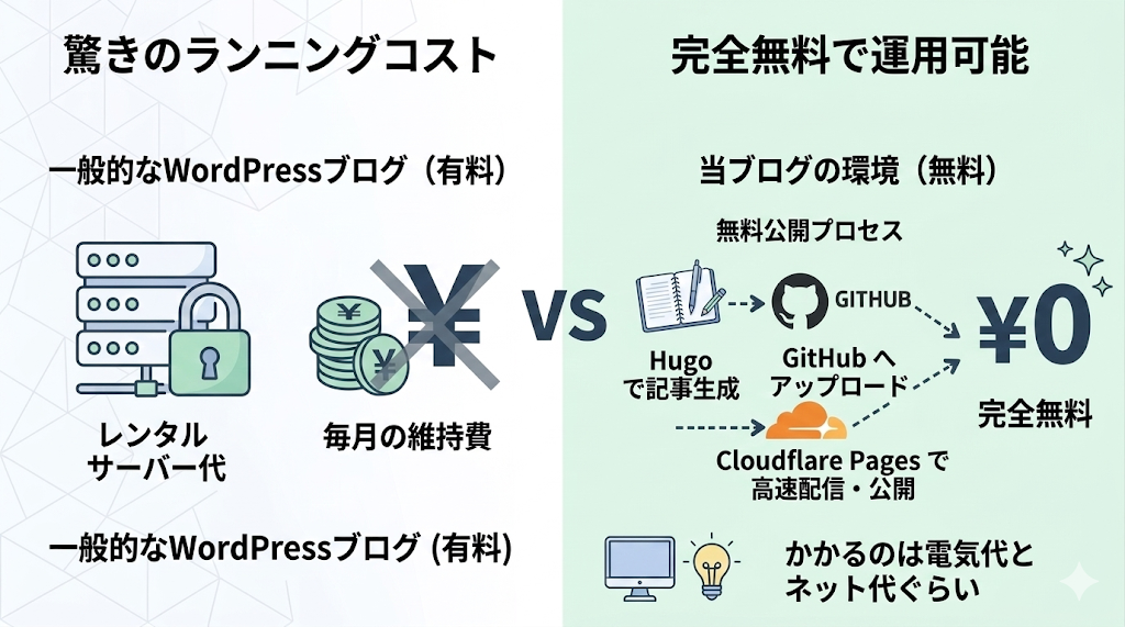 実は、この「てつblog」の運用環境にはもう一つ大きなメリットがあります。それは、ブログの維持にかかるランニングコストが完全無料であるという点です。